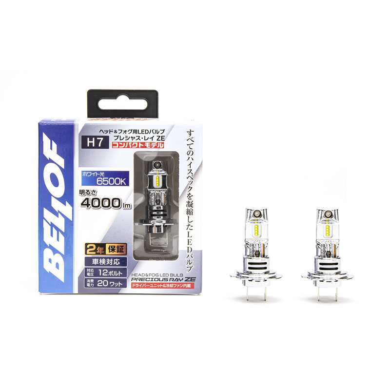 製品詳細 ”プレシャス・レイ ZE”は、点灯ドライバーユニットと冷却ファンを内蔵しながらもH7ハロゲンバルブと同形状を実現し、バルブ交換する感覚でLEDライトにアップグレードすることが可能です。